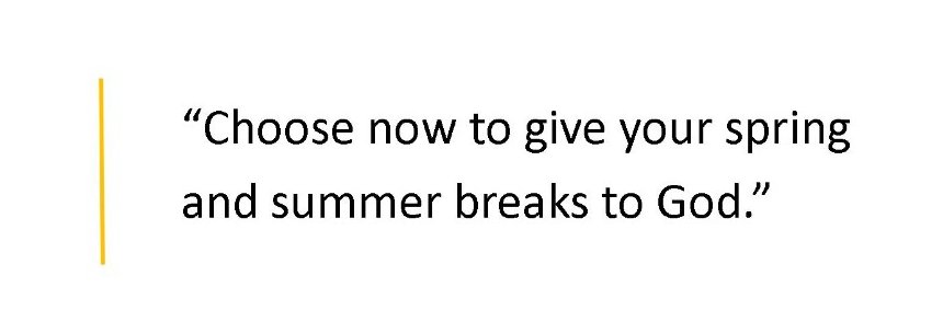 Choose now to give your breaks to God, whether he uses you across the country or across the street. Our God is an eternal and constant God, who is asking us to number our days. He is the Lord of time, and I assure you that we can trust him with ours.