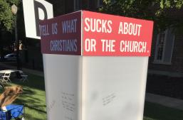 A four-sided foam board pillar, eight feet tall, a bright red sign at the top saying, “Tell us what sucks about Christians or the Church.” People couldn’t not see it. After a quick trip for supplies, Clayton and a few InterVarsity students finished “the pillar” in time for UA’s organization fair.
