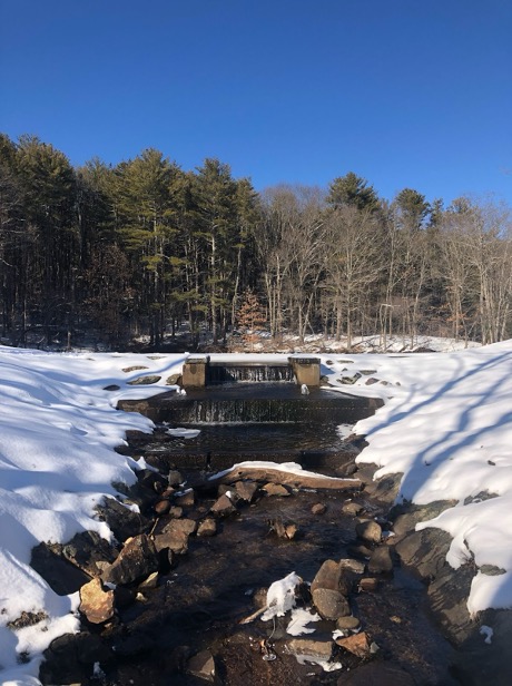waterfall at the reservoir a year later after a snowfall. And before I had even gotten close enough to see it, I could hear it. The snow was melting on the reservoir and was pouring over the waterfall. By means of the snow, the ground is watered, renewed, made ready for spring. There’s always growth happening under the snow, even if you can’t see it yet.