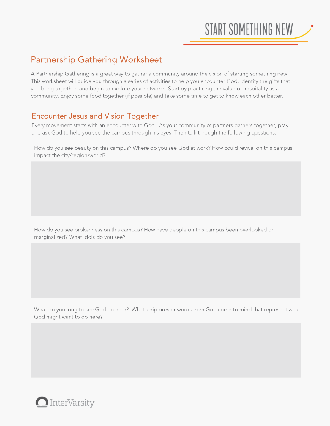 At the bottom of this page, you'll find the Partnership Gathering Worksheet to print out and share with everyone during the gathering. Make sure to bring a copy for everyone!