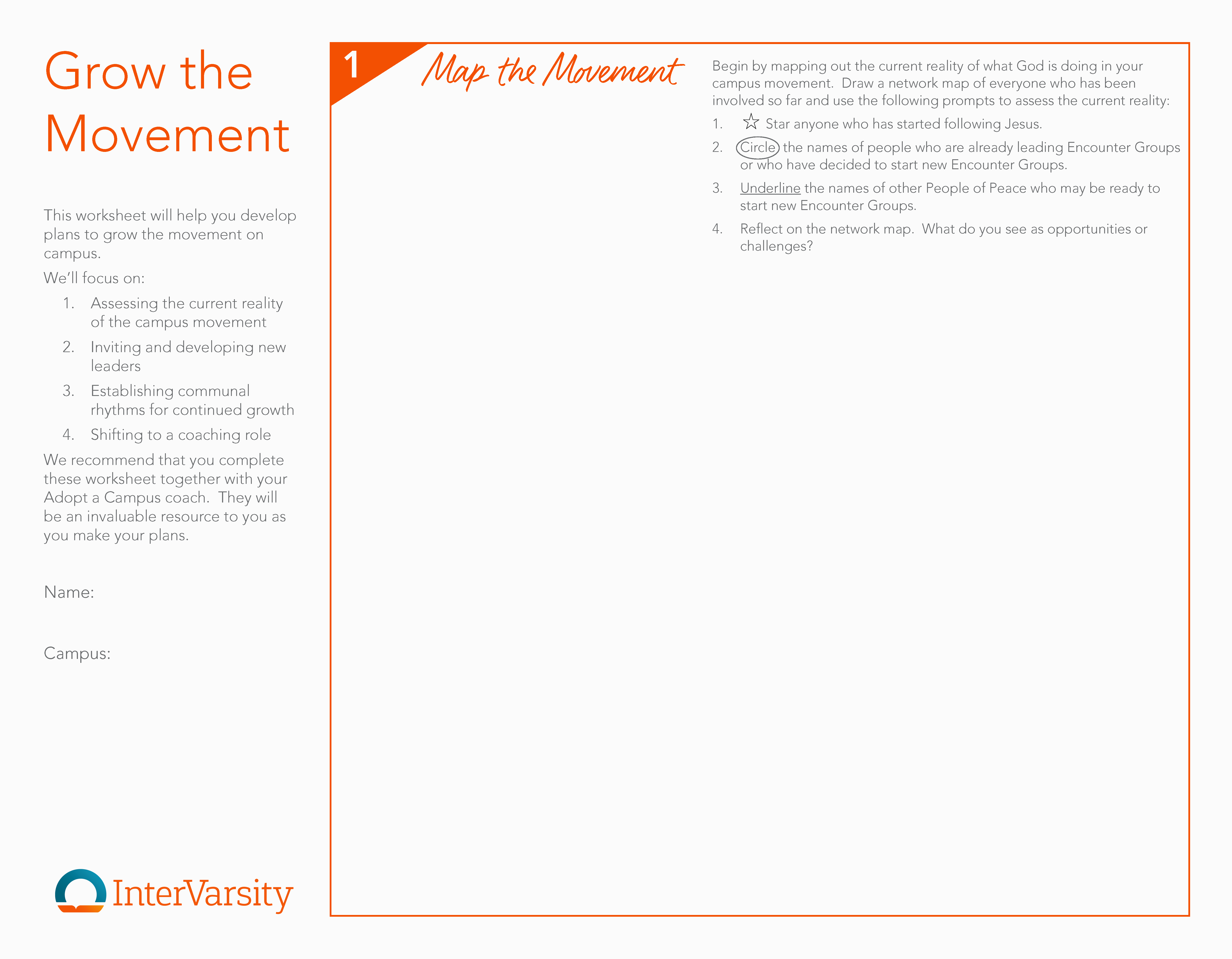 To discern the needs of the community and make plans for growth, your coach will help you work through the Grow the Movement Planning Worksheet. You'll focus on empowering new leaders, exploring new networks on campus and establishing new rhythms of community.