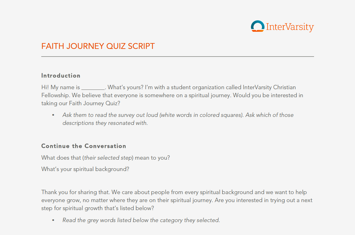 A script to practice starting spiritual conversations using the Faith Journey Quiz